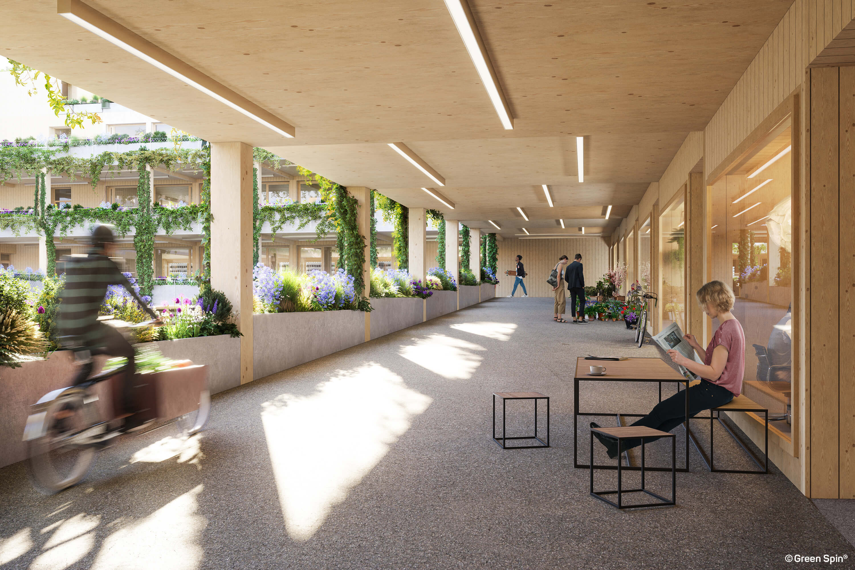 The building is a hybrid construction: with a solid basement, hybrid ceilings, and a bearing structure and façades made of timber. Energy is supplied via a local district heating network, supplemented by photovoltaic systems on the roof and façade to ensure CO₂ neutrality. The modular room structure and surface-mounted installation enable flexible use and easy conversion of the space.